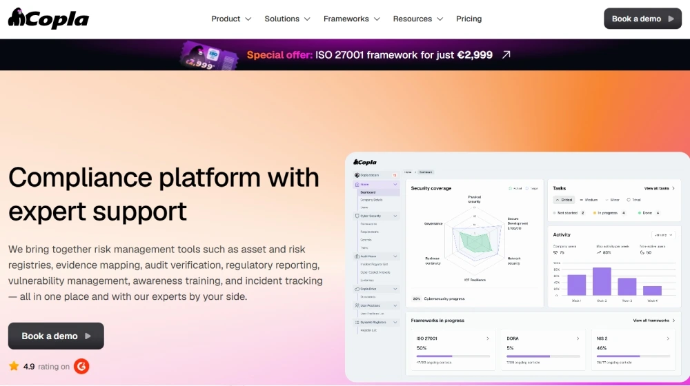 Pro Tip: Copla’s workflow-driven automation and CISO support can reduce compliance costs for SMBs by over €60k/year and 80% of manual workload. Consider bundled onboarding if your team is new to frameworks like DORA or ISO 27001.